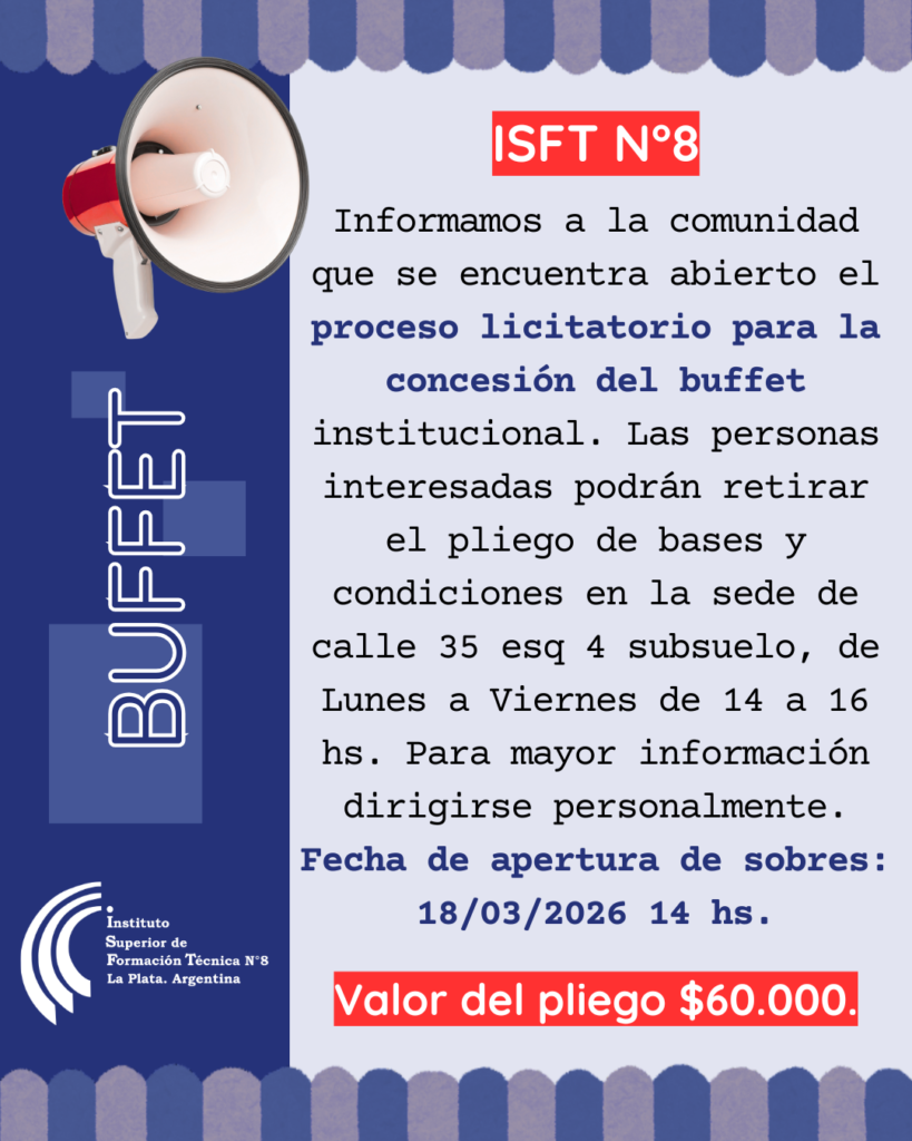 Informamos a la comunidad que se encuentra abierto el proceso licitatorio para la concesión del buffet institucional. Las personas interesadas podrán retirar el pliego de bases y condiciones en la sede de calle 35 esq 4 subsuelo, de Lunes a Viernes de 14 a 16 hs. Para mayor información dirigirse personalmente.